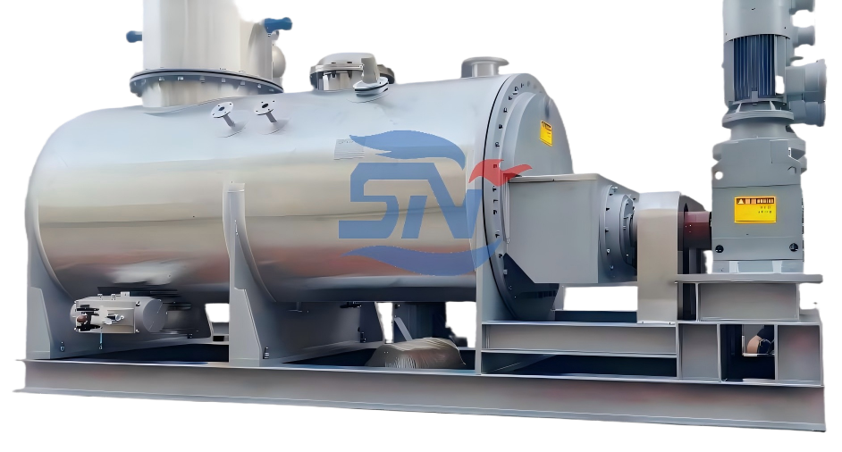 真空螺旋干燥机经过内部空心叶片结构方式,使物料在箱体内部充分循环流动,充分增加物料接触热能,干燥的物料更均匀、无死角残留,热能传递采用空心叶片以及箱体壁面热能,物料被热能包裹流动,热能几乎无损耗,整体设备采用密封工作方式,防止粉尘、气味,无外泄,利用后期冷凝回收装置,回收可利用资源以及污染物,从而达到无污染排放,根据物料对温度的要求,可采用不同的加热介质:蒸汽、热水、导热油,根据物料不同,加料方式可采用一次和分多次加入,干燥结束后排泄真空后通过出料伐开启出料。